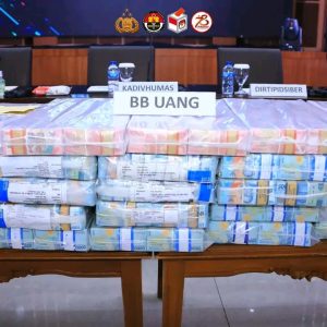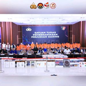 “Para tersangka dikenakan Pasal 45 ayat (3) jo Pasal 27 ayat (2) UU No. 1 tahun 2024 tentang ITE, pasal 82 dan/atau pasal 85 UU No 3 tahun 2011 tentang Tindak Pidana Transfer Dana, Pasal 3, Pasal 4, Pasal 5 jo Pasal 10 UU No. 8 tahun 2010 tentang Pencegahan dan Pemberantasan Tindak Pidana pencucian uang, serta Pasal 303 KUHP jo Pasal 55 ayat 1 KUHP dengan ancaman hukuman pidana penjara paling lama adalah 20 tahun,” tegas Kabareskrim Polri Komjen. Pol. Drs. Wahyu Widada, M.Phil., saat konferensi pers di Mabes Polri, Jakarta, Jumat (21/6). [Benn/Ismail]