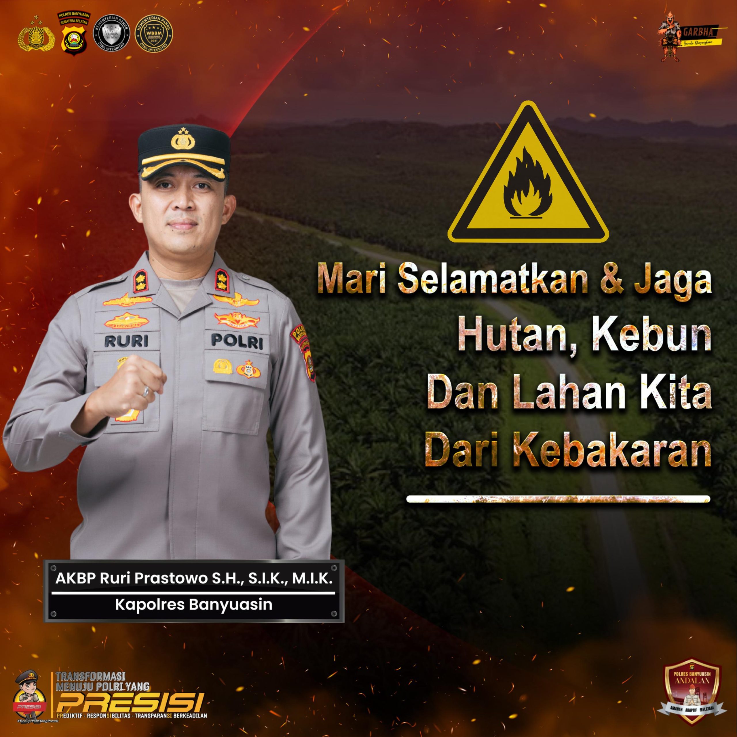 Terkait hal itu, Kapolres Banyuasin AKBP Ruri Prastowo SH SIK MIK, meminta warga Kabupaten Banyuasin agar menjaga lingkungan dengan cara tidak membuka lahan perkebunan dengan cara dibakar untuk mencegah kebakaran hutan dan lahan (Karhutla).