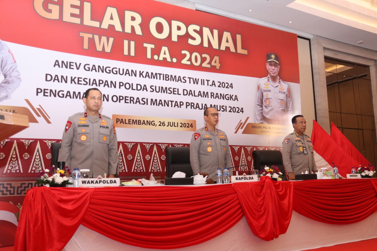 Polda Sumatera Selatan (Sumsel) menggelar Gelar Operasional (GO) Anev Gangguan Kamtibmas TW II .T.A. 2024 dan Kesiapan Polda Sumsel dalam rangka pengamanan Operasi Mantap Praja Musi 2024 yang dilaksanakan bertempat Ballroom hotel Wyndham Palembang Jum’at 26/Juli 2024 pagi