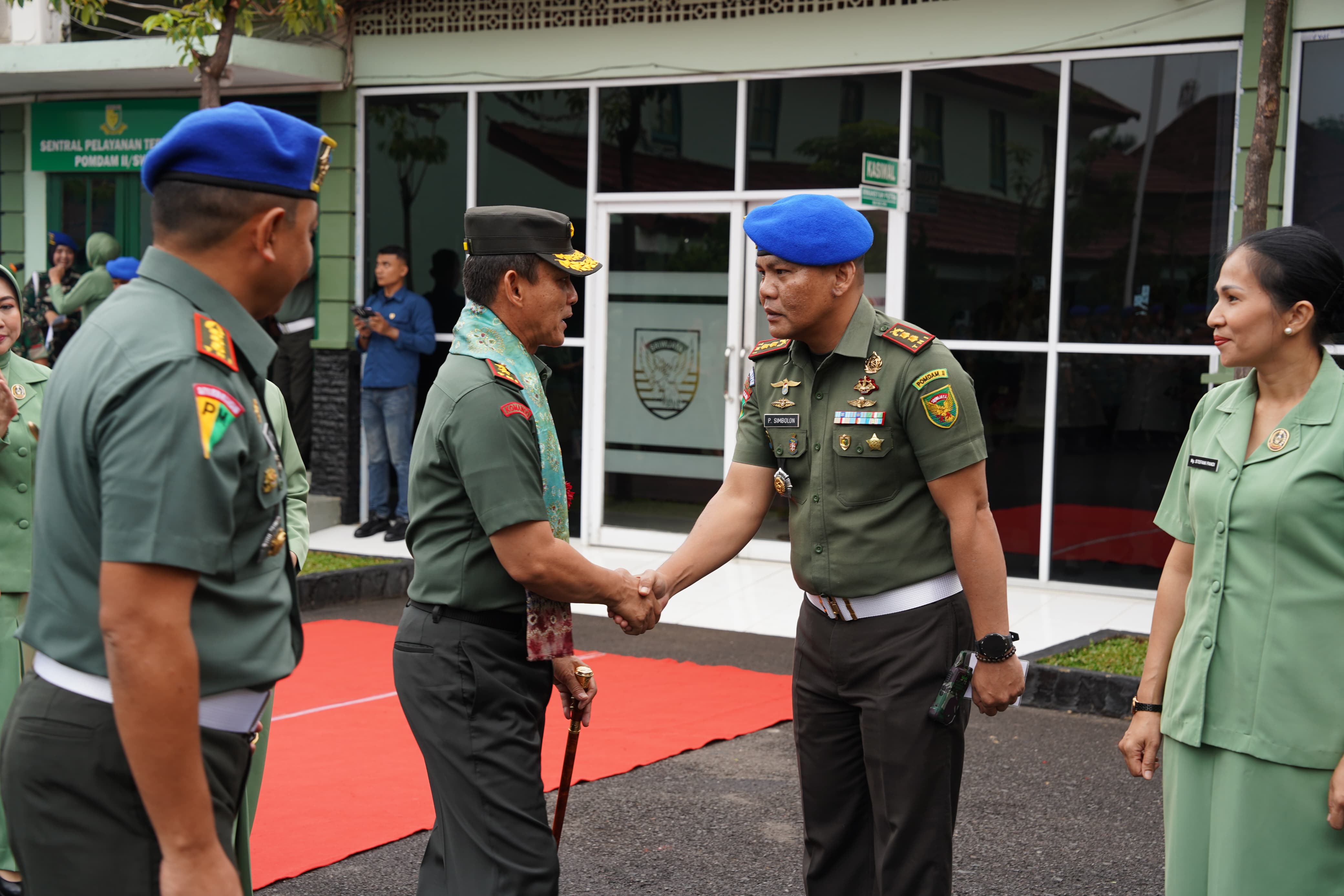 Setibanya di Mapomdam II/Sriwijaya, Pangdam II/Sriwijaya menerima laporan dari Danpomdam II/Sriwijaya Kolonel Cpm Dony Tri Windiarto, S.H., M.M., yang kemudian disambut hangat melalui prosesi pengalungan syal dan pemberian hand bucket sebagai bentuk penghormatan.