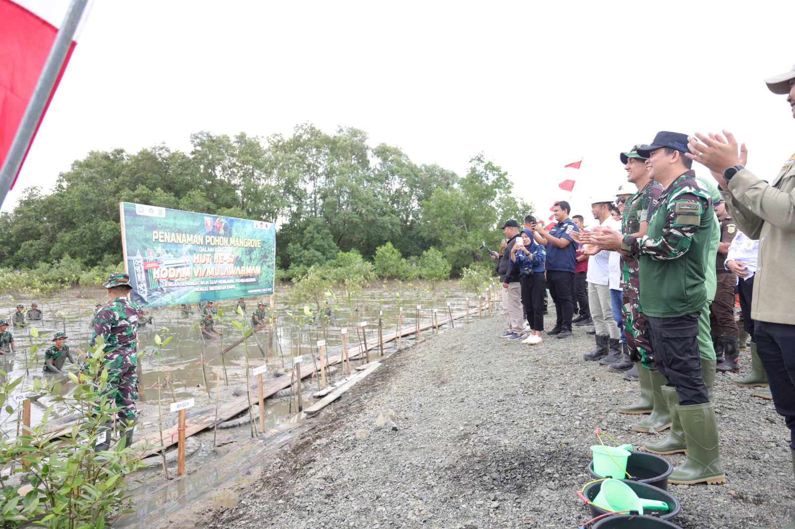 Memperingati HUT ke-67 Kodam VI/Mulawarman, Kodim 1022/Tanah Bumbu menggelar kegiatan penanaman mangrove di wilayah pesisir Kelurahan Tungkaran Pangeran, Kecamatan Simpang Empat, Rabu (02/07/2025).