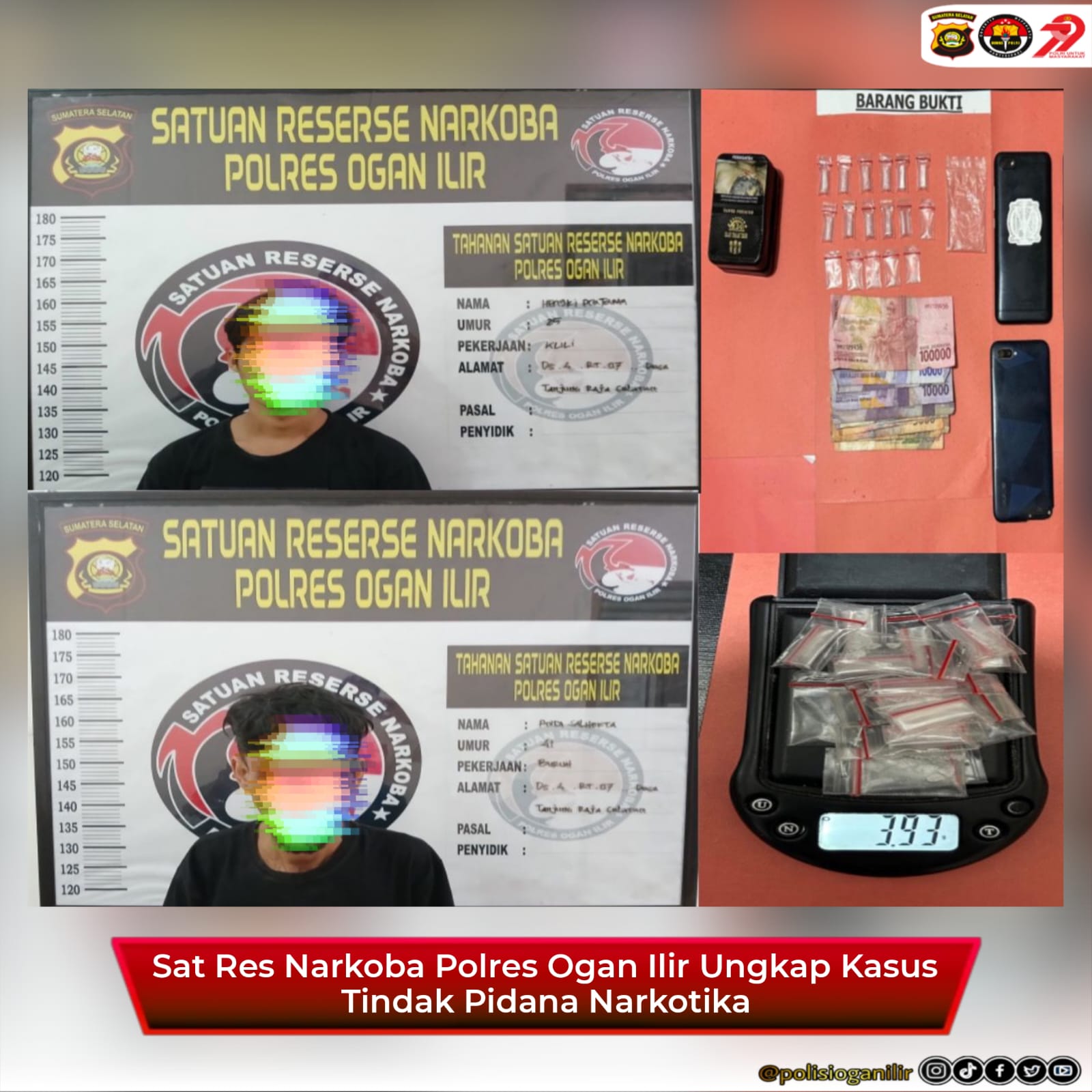 Kapolres Ogan Ilir melalui Kasat Narkoba IPTU A.Surya Atmaja S.H. menyampaikan bahwa pihaknya serius dalam memberantas peredaran narkoba di wilayah hukum Polres Ogan Ilir. “Kami tidak akan memberi ruang bagi peredaran narkoba. Kami mengapresiasi laporan dari masyarakat dan memastikan bahwa semua informasi akan segera kami tindaklanjuti. Saat ini kedua tersangka sudah kami amankan dan kasus ini masih kami kembangkan untuk menelusuri kemungkinan adanya jaringan lain,” tegas IPTU A.Surya Atmaja S.H.
