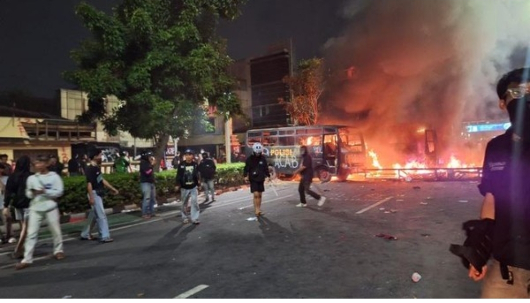 Sejumlah massa membakar dua unit bus polisi yang terparkir di eks gedung Mapolres Metro Jakarta Pusat di Jalan Kramat Raya. Massa juga mengambil sejumlah barang dari dalam gedung.