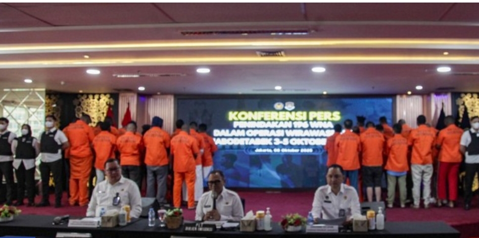 Plt Dirjen Imigrasi Yuldi Yusman memaparkan kasus 196 WNA bermasalah dalam konferensi pers Operasi Wira Waspada di Kantor Ditjen Imigrasi, Jakarta, Rabu (8/10/2025). Dari 196 orang, terdiri atas 82 WN Nigeria, 28 WN India, 21 WN Spanyol.
