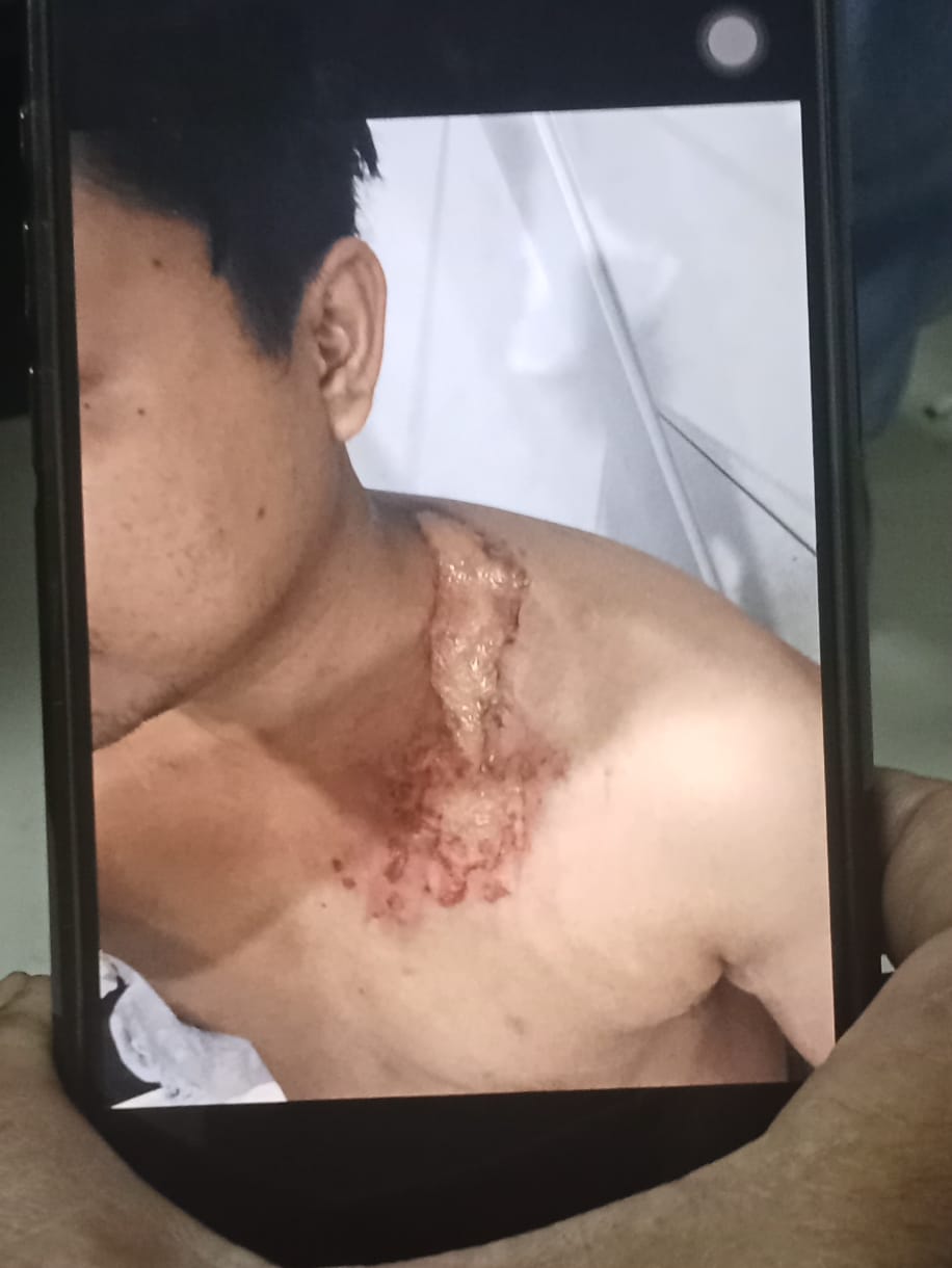 Lalu siterdakwa menyiramkan bakso berkuah panas ketubuh korban. Setelah penyiraman pelaku Muji S, di piting oleh Bara.