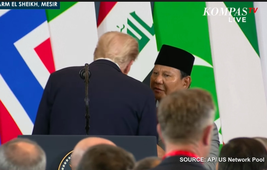 Presiden RI Prabowo Subianto tampak menghampiri Presiden Amerika Serikat (AS) Donald Trump di atas panggung, tepat setelah pidato Konferensi Tingkat Tinggi (KTT) Perdamaian tentang Gaza di Sharm El-Sheikh di Kairo, Mesir selesai.