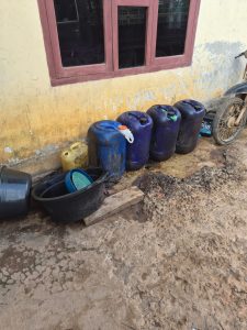 2 buah corong (biru dan hijau), 2 baskom hitam, serta potongan botol aqua ukuran 1 liter yang diduga digunakan sebagai alat untuk memindahkan BBM.